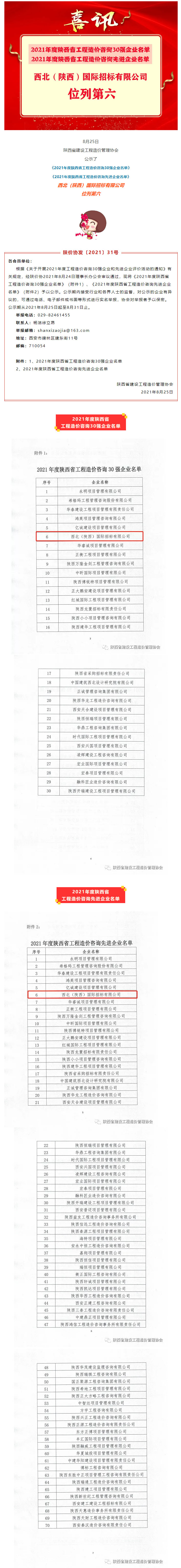2021年度陜西省工程造價(jià)咨詢(xún)30強(qiáng)企業(yè)與先進(jìn)企業(yè)名單公示!我公司位列第六!