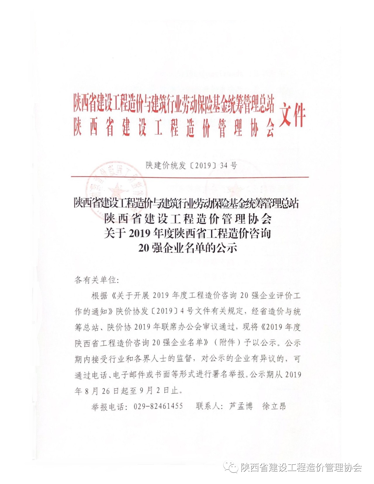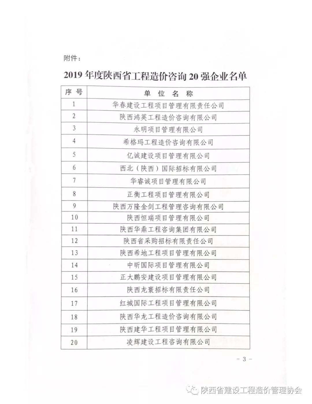 2019年8月26日,陜西省建設工程造價管理協(xié)會(簡稱陜價協(xié))發(fā)布“關于2019年度陜西省工程造價咨詢20強企業(yè)名單”公示,西北(陜西)國際招標有限公司再次入圍,榮獲“第六名”。