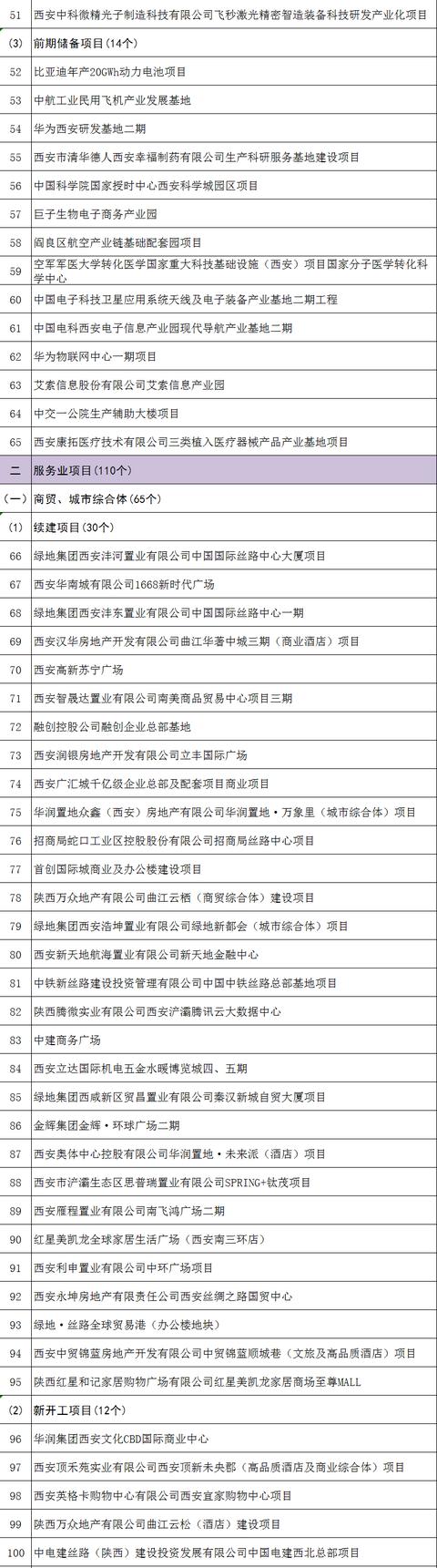 近日,西安市2020年市級重點項目名單發(fā)布。2020年西安市共安排368個重點項目,其中先進制造業(yè)項目65個,包含制造業(yè)項目18個、戰(zhàn)略性新興產(chǎn)業(yè)項目47個;服務業(yè)項目110個,包含商貿(mào)城市綜合體項目65個、物流會展科技服務項目45個;文化旅游產(chǎn)業(yè)項目23個,包含文化產(chǎn)業(yè)項目15個、旅游產(chǎn)業(yè)項目8個;城建及基礎設施項目50個,包含電力供氣項目7個、機場鐵路地鐵道路項目43個;生態(tài)環(huán)保項目29個,包含垃圾處理項目3個、治水項目21個、治綠項目5個;社會事業(yè)和民生保障項目91個,包含教育項目22個、體育衛(wèi)生項目34個、老舊小區(qū)改造和背街小巷改造項目8個、安置房建設項目23個、其他項目4個,具體名單如下。