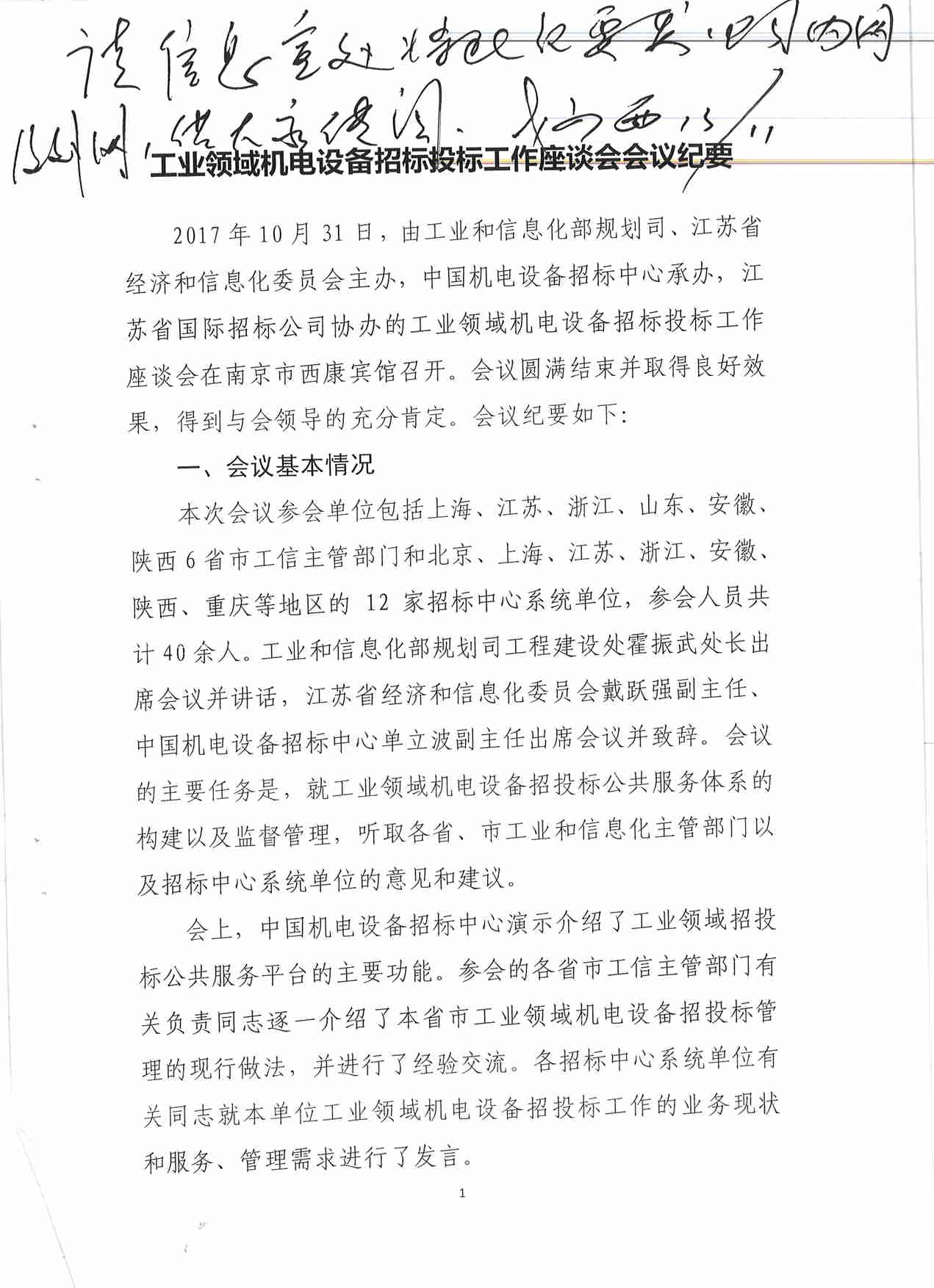 由工信部規(guī)劃司主辦,在南京召開(2017年10月31日)的 “工業(yè)領(lǐng)域機電設(shè)備招投投標(biāo)工作座談會”《會議紀要》現(xiàn)已下發(fā)。全國6省市工信主管部門和12家招標(biāo)代理機構(gòu)參加此次座談會,我公司董事長總經(jīng)理戈乃西受邀參加會議。