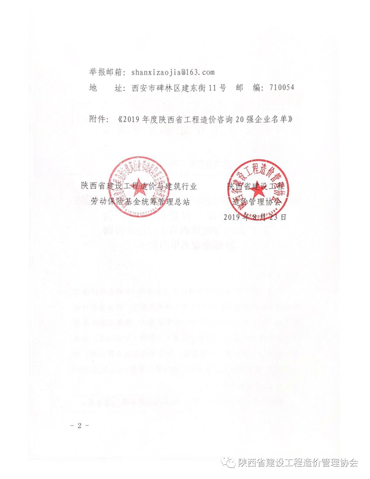 2019年8月26日,陜西省建設工程造價管理協(xié)會(簡稱陜價協(xié))發(fā)布“關于2019年度陜西省工程造價咨詢20強企業(yè)名單”公示,西北(陜西)國際招標有限公司再次入圍,榮獲“第六名”。