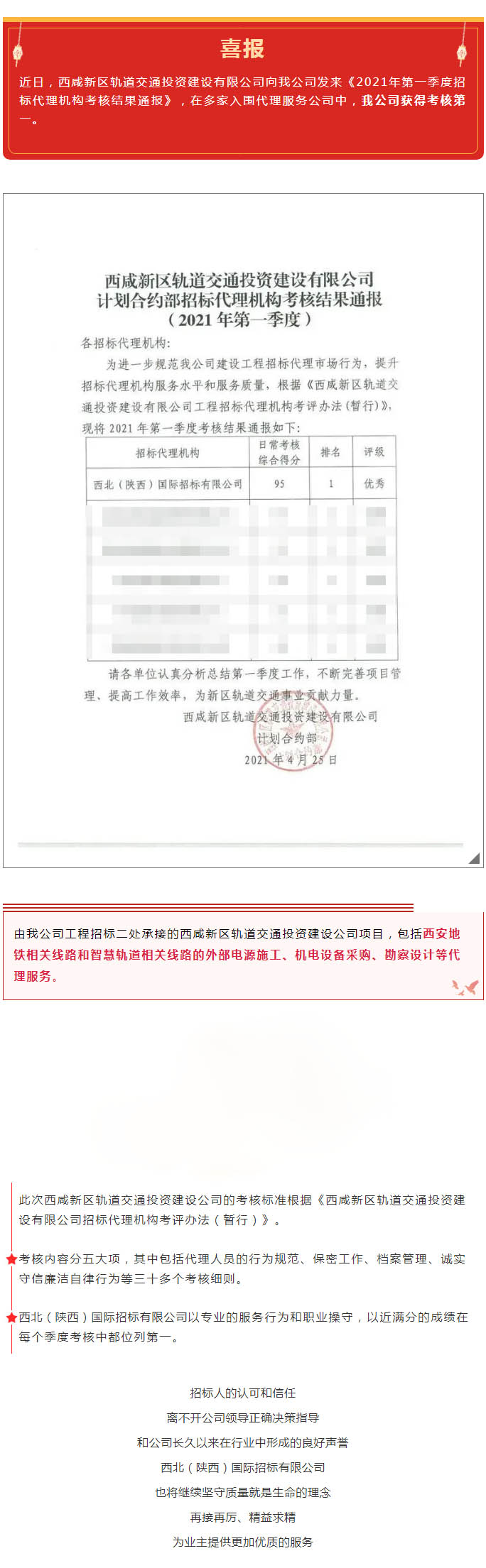 我公司獲西咸新區(qū)軌道交通投資建設有限公司《招標代理機構考核》2021年第一季度考核第一名