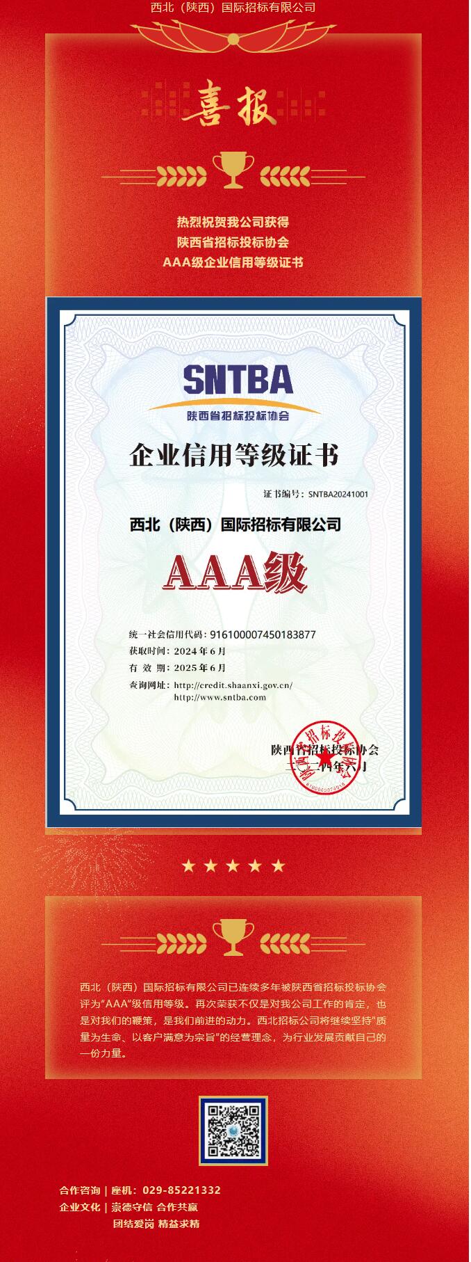熱烈祝賀我公司獲得陜西省招標投標協(xié)會AAA級企業(yè)信用等級證書