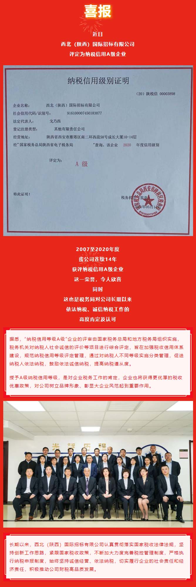西北(陜西)國際招標(biāo)有限公司連續(xù)14年被評為納稅信用A級企業(yè)
