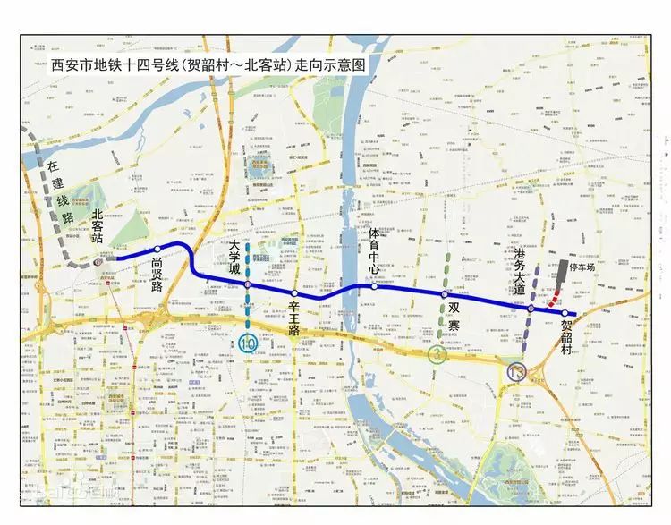 西安地鐵十四號線(最初規(guī)劃為十三號線)為東西走向,規(guī)劃東端起點為國際港務(wù)區(qū)窯村機場西側(cè),跨灞河后抵達(dá)北客站,與機場線貫通運營。一期工程為賀韶村到~北客站(不含),主要為配合2021年西安第十四屆全運會建設(shè)。線路長度約13.8km,依次沿向東路-學(xué)府中路(建材北路)-開發(fā)大道鋪設(shè),共設(shè)賀韶村站~港務(wù)大道站~三義莊站(新增)~雙寨站~體育中心站~辛王路站~學(xué)府路(大學(xué)城)站~尚賢路站車站8座(不含北客站),其中換乘站3座,均為地下站,設(shè)一處停車場(賀韶村停車場),設(shè)主變電所1座(太華北路與學(xué)府中路東北象限)。